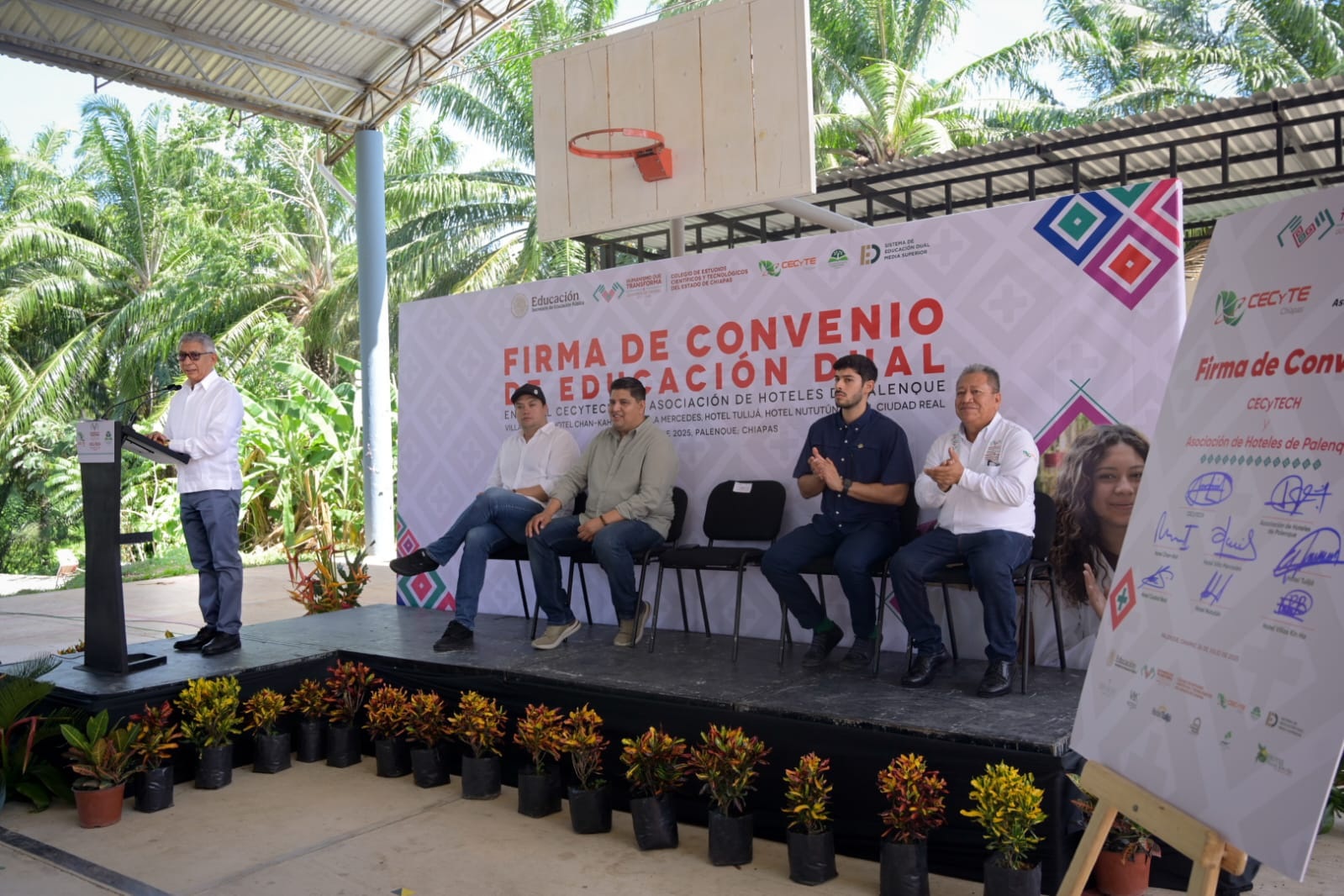 El evento se llevó a cabo en el domo del Plantel 19 de Palenque y fue encabezado por el director general del Cecytech, Luis Guadalupe Morales Ángeles, y el presidente municipal de Palenque, Jorge Cabrera Aguilar, quienes resaltaron la importancia de establecer alianzas que fortalezcan la formación integral de la juventud chiapaneca.