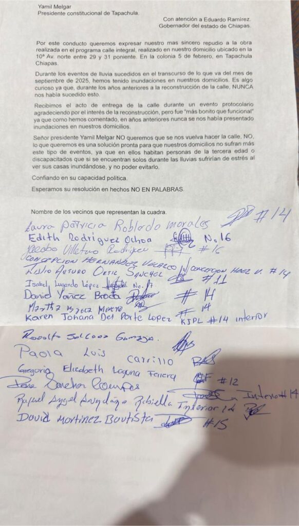 Tapachula, Chiapas 28 de Septiembre del 2025.- Habitantes de la colonia 5º de Febrero en el municipio de Tapachula, responsabilizaron al todavía Presidente Municipal de Tapachula, Yamil Melgar de entregar obras mal hechas. Es el caso de la pavimentación de la 10ª avenida norte entre 29 y 31 calle poniente de esta ciudad.