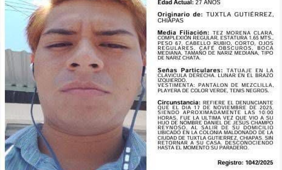 Daniel de Jesús Champo Reynoso, de 27 años, originario de Tuxtla Gutiérrez, fue visto por última vez el 17 de noviembre alrededor de las 10:00 horas. Su complexión es regular, tez morena clara, mide aproximadamente 1.65 metros, tiene el cabello castaño oscuro corto y un tatuaje en la clavícula derecha. Vestía pantalón de mezclilla, playera verde y tenis negros. La familia pidió reportar cualquier información al 911 o directamente a la Fiscalía, donde ya circulan las fichas oficiales de búsqueda.